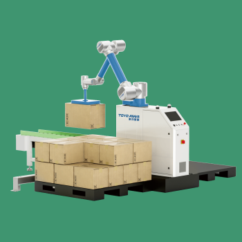 TA-MD40Maxは、最大40kgまでの可搬能力を持つパレタイジングロボットで、物流、製造、食品・日用品業界など、幅広い分野に適した中量級モデルです。 1700mmの広い作業半径と2100mmの垂直積載高さを備え、パレット上への積み付け作業を高精度かつ安定的にこなします。 本機の最大の特長は、±0.04mmの繰り返し位置精度による正確な積載性能。積載ズレや倒壊のリスクを最小限に抑えることで、安全性と品質の両立を実現しています。 また、TCP/IP通信方式により、既存の生産管理システムやライン制御との統合も容易で、拡張性にも優れています。 さらに、IP54等級の防塵・防滴設計と0〜55℃の広い温度耐性により、さまざまな作業環境でも安定稼働が可能です。設置面積は1505mm×1716mmと省スペースでありながら、最大500kgの堅牢な筐体で耐久性も抜群です。